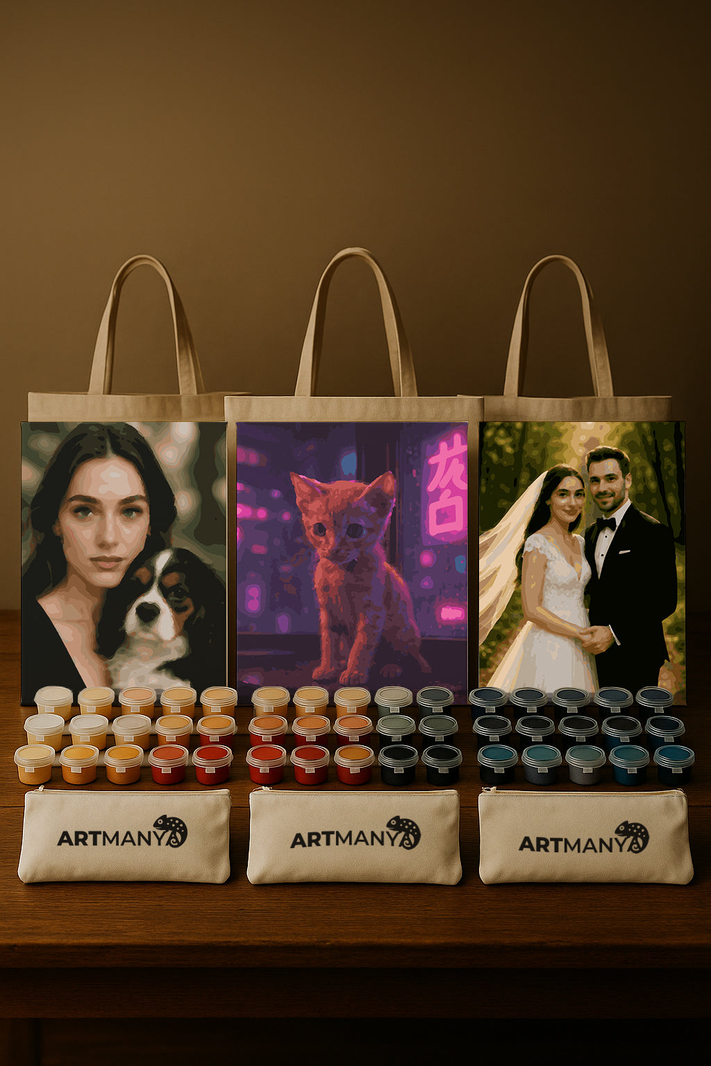 Dilersen aynı görseli, dilersen üç farklı fotoğrafı bize gönderin. Biz her birini boyamaya hazır kişisel tuval olarak hazırlayıp set halinde gönderelim.