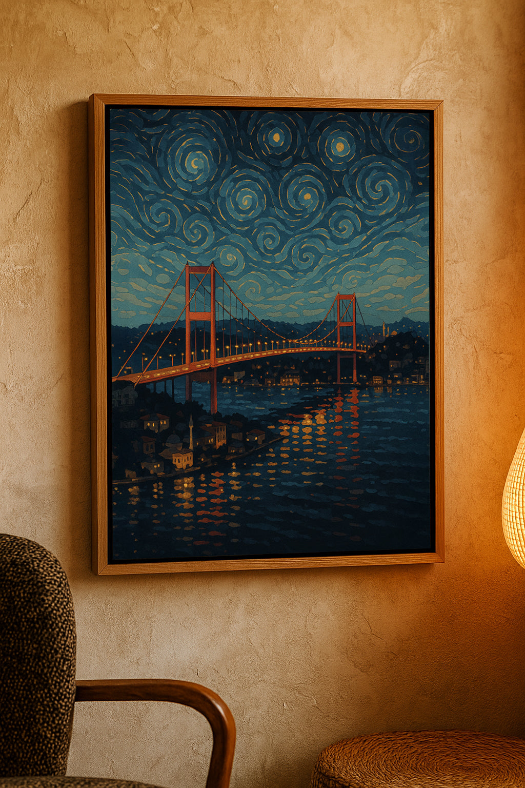 Van Gogh’un büyüleyici “Yıldızlı Gece” dokusundan ilham alan bu özel serimiz, Türkiye’nin tarihi güzellikleriyle harmanlandı. 40×50 cm tuvalimiz, uzun ömürlü kullanım için sağlam şaseye gergin şekilde hazırlanır ve dalgasız, stabil bir yüzey sunar.